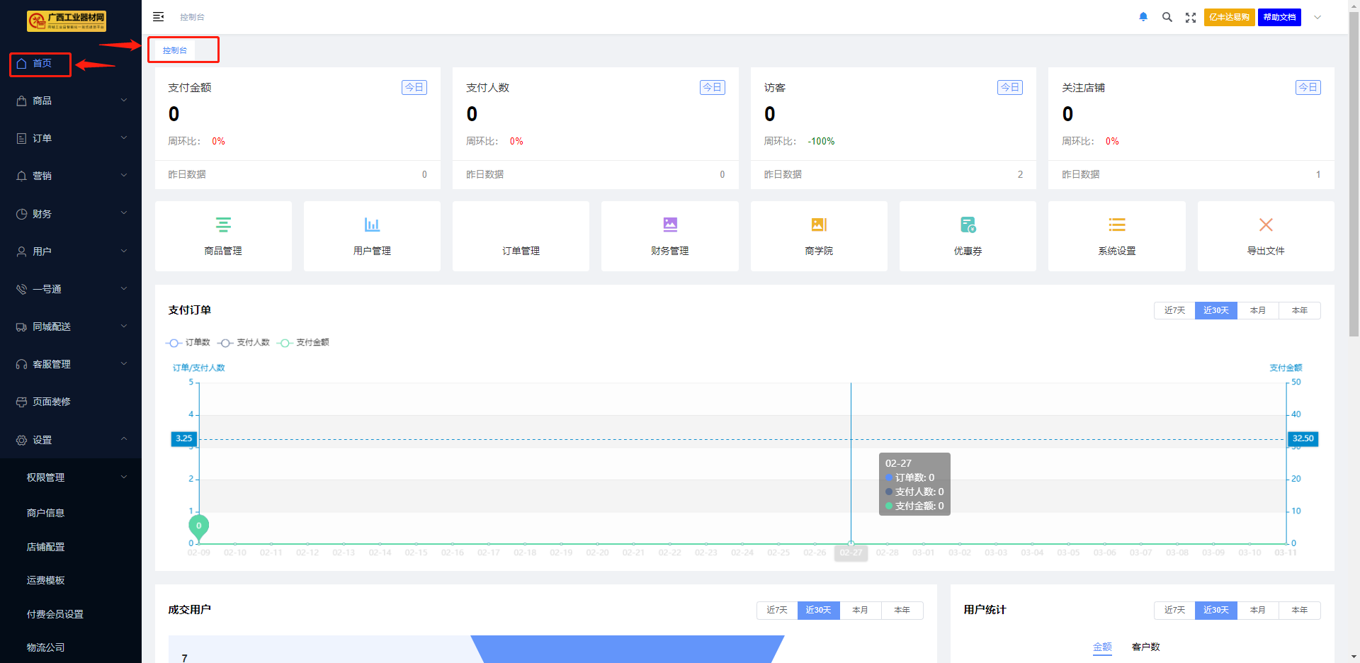 ####点击页面侧边工具栏,首页>控制台 数据统计功能可以实时查看到店铺核心数据,如订单量、收入情况、商品销售情况、会员消费情况,并以图表展示,能够时刻掌握到店铺经营变化。   #####1、模块一:【支付金额】 ```json 支付金额:即为今日收到客户支付金额总数; 周环比是指连续2个统计周期(比如连续两周)内量的变化比,即:环比=(本周数-上周数)/上周数×100% 昨日数据,即为昨天收到支付金额总数。 ``` #####2、模块二:【支付人数】 ```json 支付人数:即为今日收到支付金额的客户次数; 周环比是指连续2个统计周期(比如连续两周)内量的变化比,即:环比=(本周数-上周数)/上周数×100% 昨日数据,即为昨天收到支付金额次数; ``` #####3、模块三:【访客】 ```json 访客:即为今日访问店铺的客户次数 周环比是指连续2个统计周期(比如连续两周)内量的变化比,即:环比=(本周数-上周数)/上周数×100% 昨日数据:即为昨天访问店铺的客户次数; ``` #####4、模块四:【关注店铺】 ```json 关注店铺:即为今日关注店铺的客户人次; 周环比是指连续2个统计周期(比如连续两周)内量的变化比,即:环比=(本周数-上周数)/上周数×100% 昨日数据,即为昨天关注店铺的客户人次; ``` #####5、模块五:【支付订单】 ```json 在图表右侧上方点击【近7天、近30天、本月、本年】选择所要查询时间段内的交易订单数、支付人数、支付金额的数据透视图列表; ``` #####6、模块六:【成交用户】 ```json 在图表右侧上方点击【近7天、近30天、本月、本年】选择所要查询时间段内的成交用户数据的分析; 访客:选择所查询时间段内的访客人数总次数,访客下单转化率 下单:选择所查询时间段内的下单人数总次数、下单金额总金额,以及下单支付转化率; 支付:选择所查询时间段内的支付人数总次数、支付总金额以及客单价; ``` #####7、模块七:【用户统计】 ```json 在图表右侧上方点击【近7天、近30天、本月、本年】选择所要查询时间段内的新用户、老用户的客户总数据、交易金额; ``` #####8、模块八:【商品支付排行】 ```json 在图表右侧上方点击【近7天、近30天、本月、本年】选择所要查询时间段内的商品成交量的排名数据分析; ``` #####9、模块九:【商品访问排行】 ```json 在图表右侧上方点击【近7天、近30天、本月、本年】选择所要查询时间段内的商品被访问的次数排行,从最高访问次数排名; ``` #####10、模块十:【商品加购排行】 ```json 在图表右侧上方点击【近7天、近30天、本月、本年】选择所要查询时间段内的商品被复购(加购)次数排行,从最高加购次数排名; ```